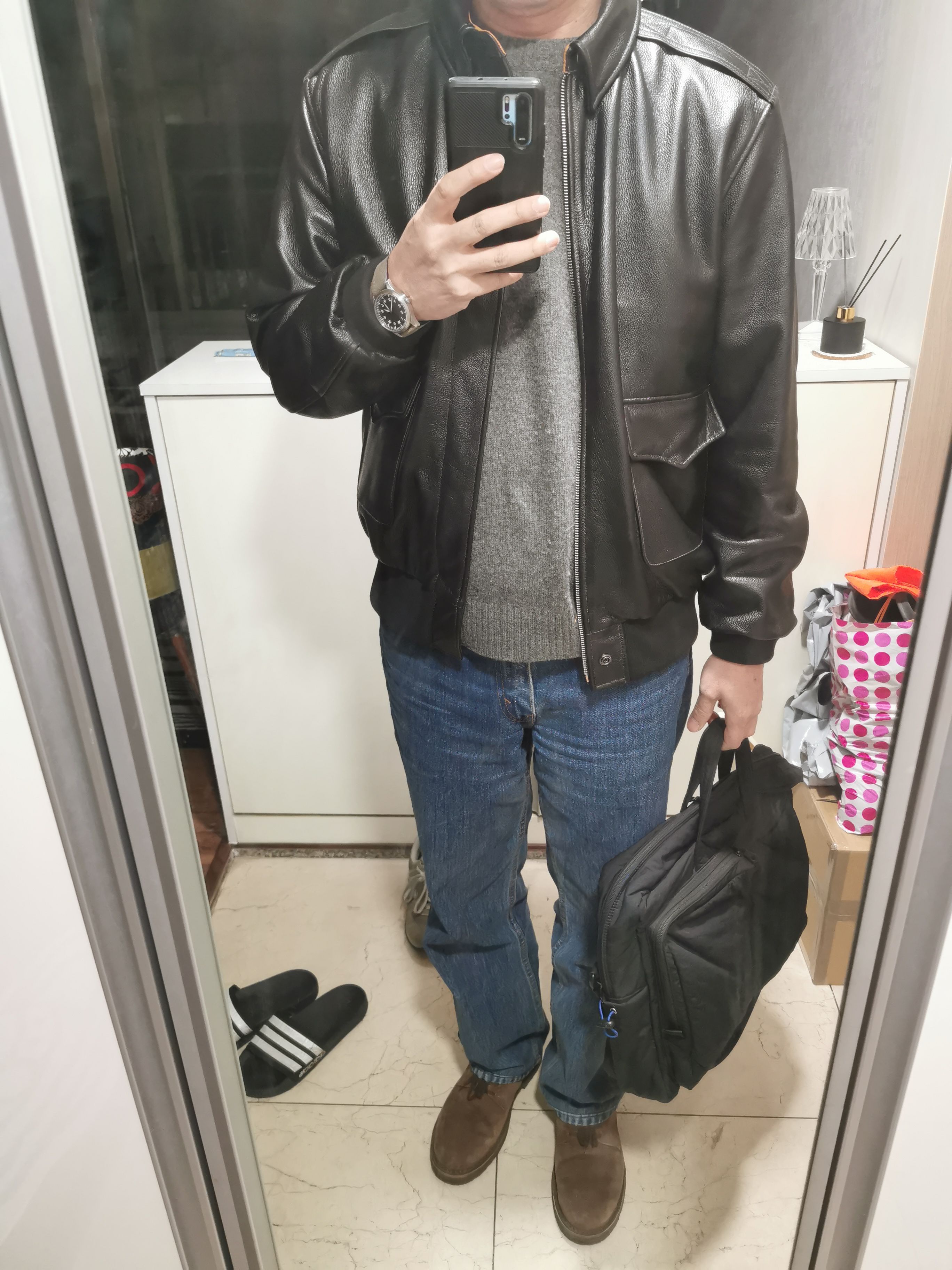 다른분들은 말가죽을 대략 15~18만정도 많이들 구입하신분들이 많은데 뻣뻣하다는 평이 많아서 그냥 소가죽이고 팔에 공군마크가 싫어서 본 제품을 주문하게되었습니다. 솔직히 일단 너무 저렴한 가격에 속는셈 치고 구입해봤습니다.