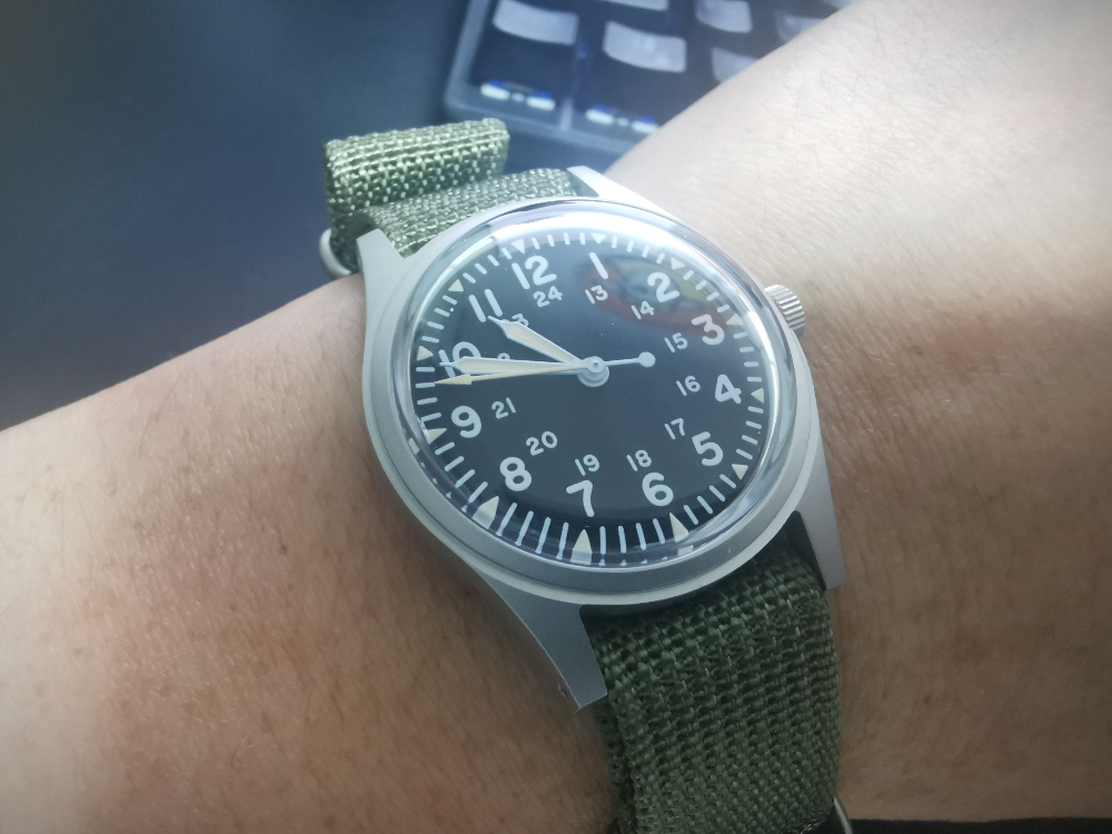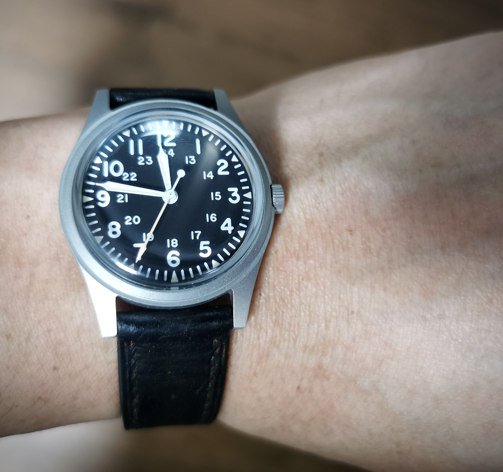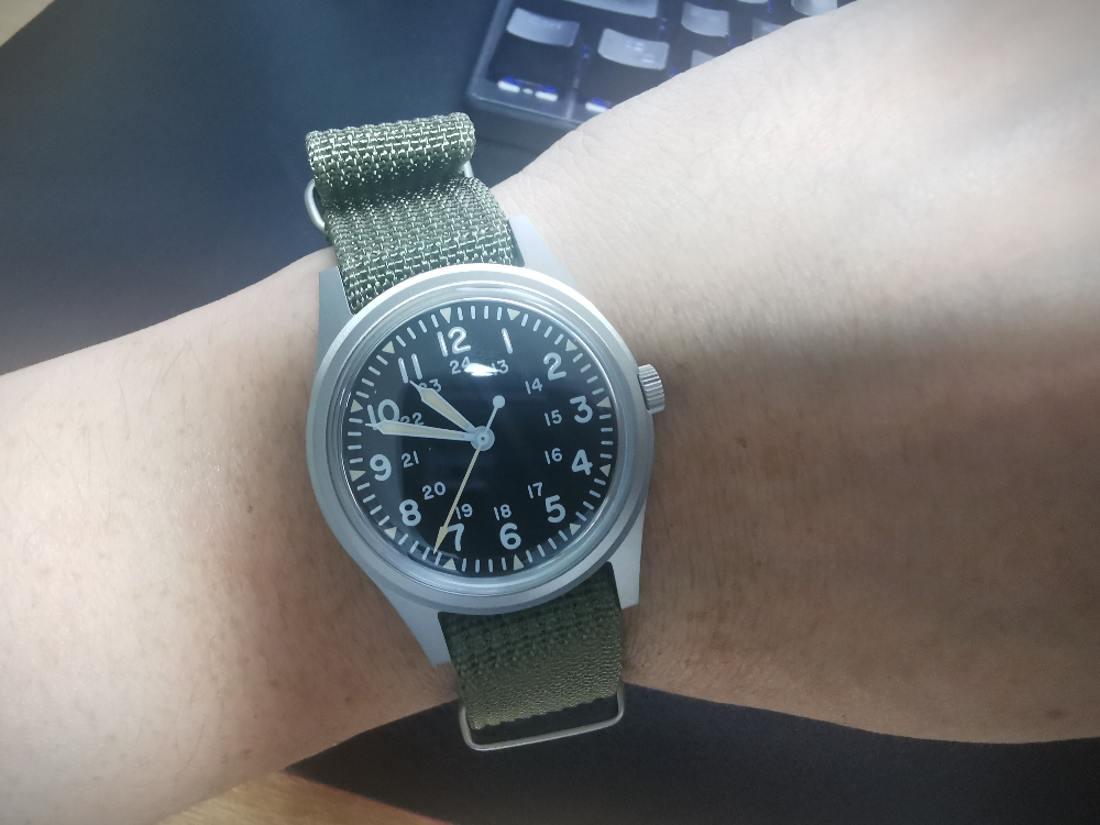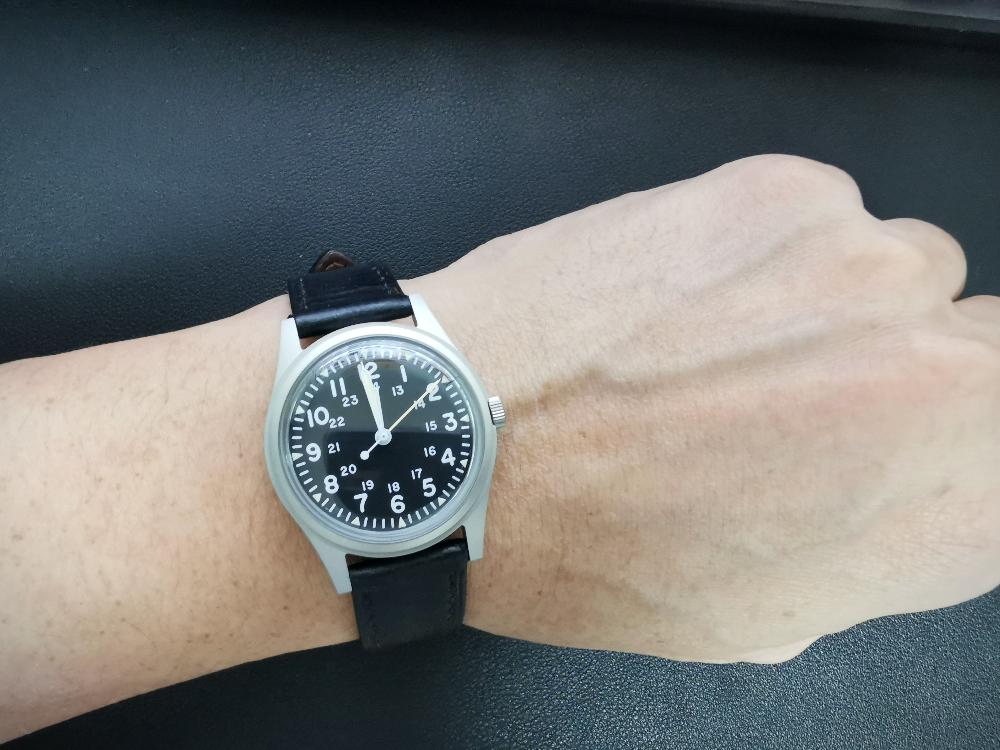 베트남전 군용 시계의 가장 근접한 사이즈의 크기로 돔글래스나 케이스 마감등 가격에 믿기지 않는 마감입니다. 하지만 실제로 착용시 생각보다 작은 느낌이 많이 들기때문에 이부분은 호불호가 많을 듯합니다. 개인적으로 손목좀 굵고 운동좀 하셨다는 분에게는 추천하지 않습니다. 제가 손목이 덩치대비 가는 편인데도 상당히 작아보입니다. (180/80kg)