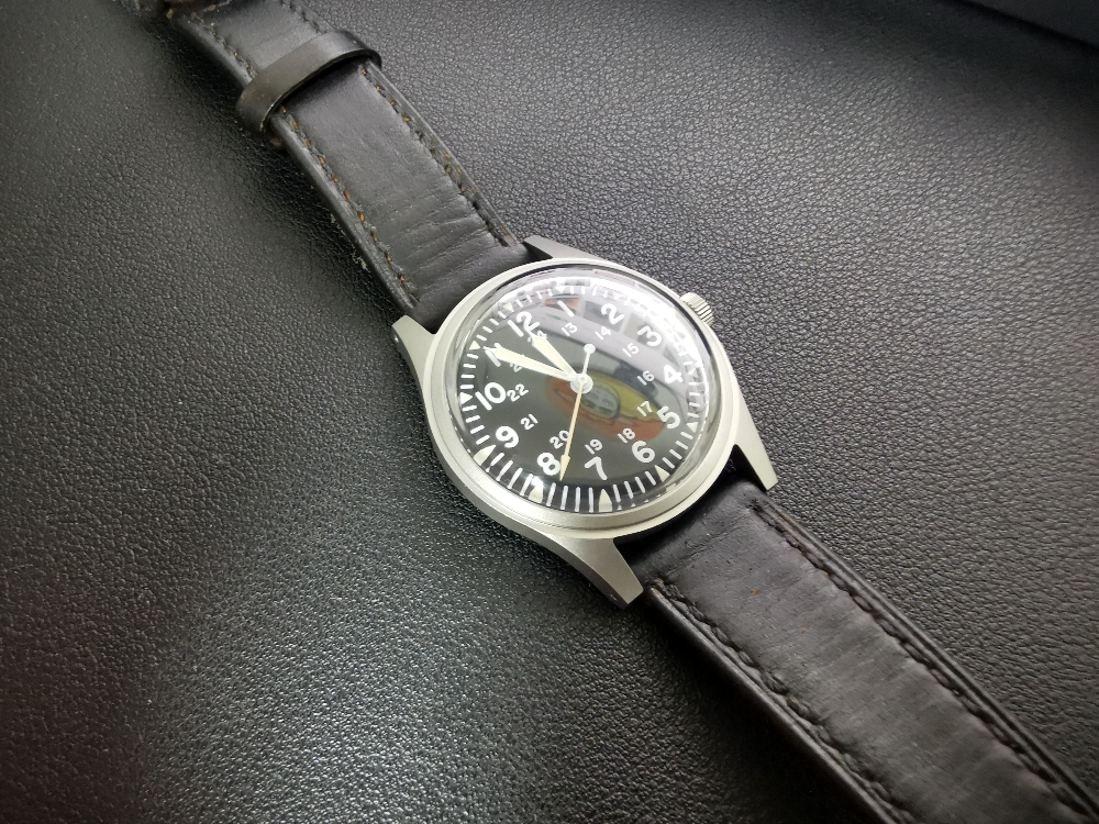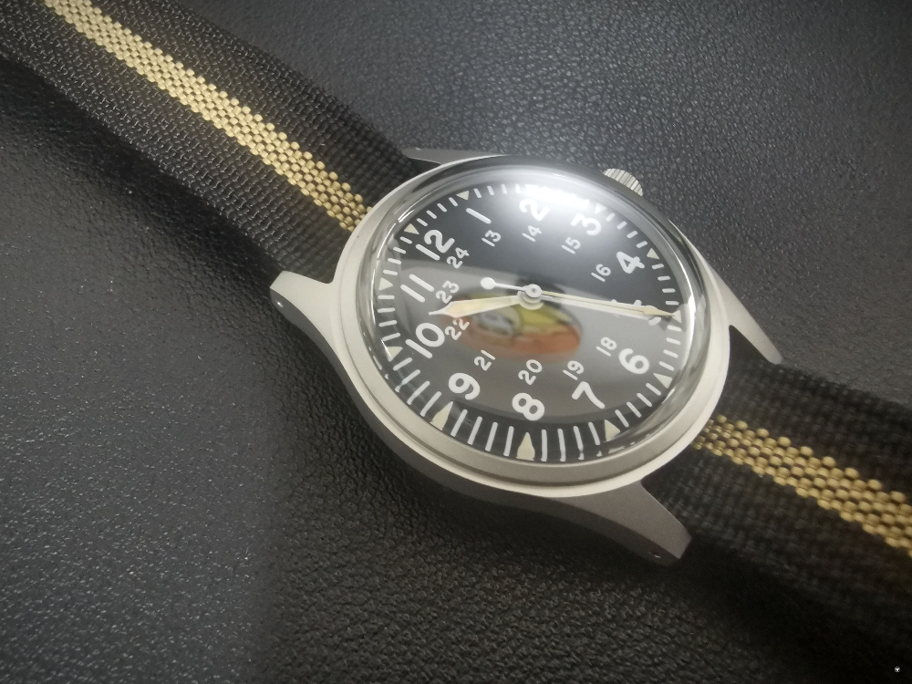 두번째로 해밀턴 카키필드를 연상시키는 미려한 워치페이스 입니다. 촛침까지 야광처리가 되어있고 시인성이 좋은 시간표기 방식은 밀리터리 워치 오리지널과 동일 디테일입니다.